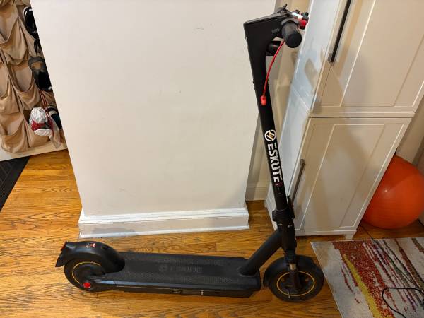 Up for sale is an Eskute ES MAX electric scooter. It has a 35 Miles Range, max speed of just under 19 MPH, and 10'' solid tires, 265lbs Max Load, Dual Brakes & Suspension Electric Scooters. I have had this scooter for just under a year and have had no issues. Surprisingly smooth ride, long battery life and lite weight if carrying up/down to the subways. The only minor issue is a small chip below the starter button, which does not affect the scooter in the slightest. Comes with the charger cord. Paid over 400$ for this a year ago so this is priced to move! Pick up on the Upper East Side.