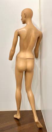 The Vintage Female Mannequin- Caprice- is a realistic, 6' tall figure made from fiberglass with a full body molded form. Featuring a matte texture and painted makeup, this mannequin comes with detachable waist and arms for added versatility. She does not have hands (see photo). Perfect for retail and services businesses, this standing pose mannequin is ideal for displaying clothing and accessories in a lifelike manner.