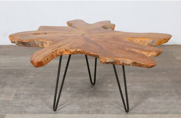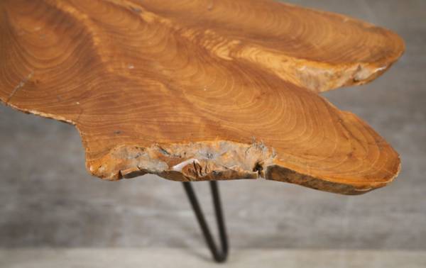 Contemporary live edge end table in the style of George Nakashima (Spokane, WA, 1905-1990). 21st century. Live edge wood slab in radial form atop four metal hairpin legs. Light wear, scratches, nicks and marks to wood throughout top. Wear and scratches to metal.