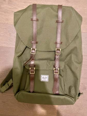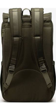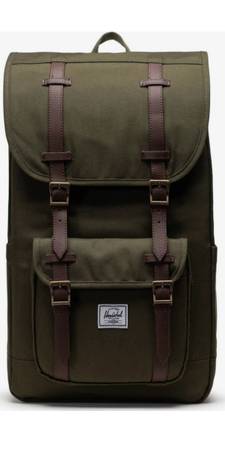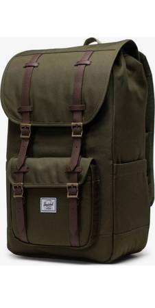 This Herschel Supply Co. Little America Backpack in Ivy Green is designed for men and crafted from polyester canvas material. The backpack features a casual style with outdoor-themed accents. It includes a padded compartment suitable for most 15" laptops, exterior flap pockets with buckle closures, and side pockets for added storage. The bag measures 19.25" in height, 11.25" in width, and 7" in depth, with adjustable backpack straps and a top carry handle for convenience. The brand Herschel is known for its quality and design aesthetic, making this backpack a stylish and functional choice for everyday use.