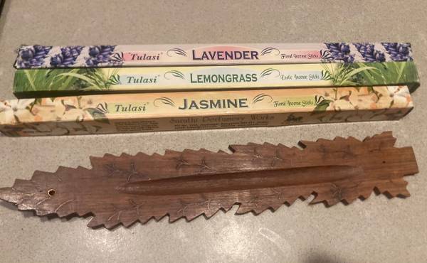 $20 for the lot (incense and holder): Three boxes of incense (brand new, unopened) Lemongrass Lavender Jasmine along with wooden holder, a stick sits in the small hole (at base), standing/leaning up...