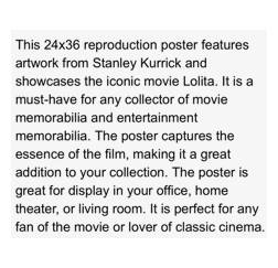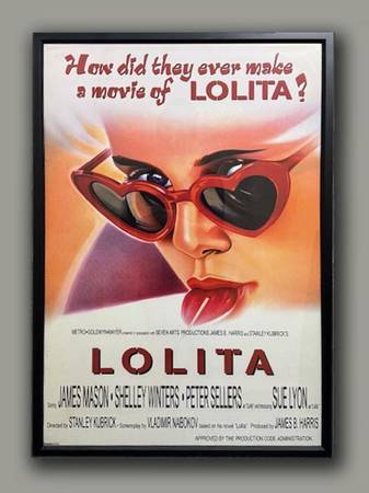 Large Framed Lolita Movie Poster, Lightweight and easy to hang...24" x 36" inches, Classic Stanley Kubrick Movie Poster. perfect condition. See photos for more detailed description.