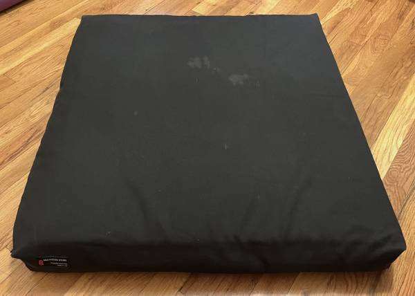 Monastery Store's top of the line zafu offering, it was $150 new. Two layers of cushions, washable black soft canvas covering, about 29 x 31 inches. It's a very nice plush zafu.