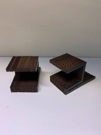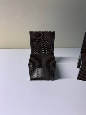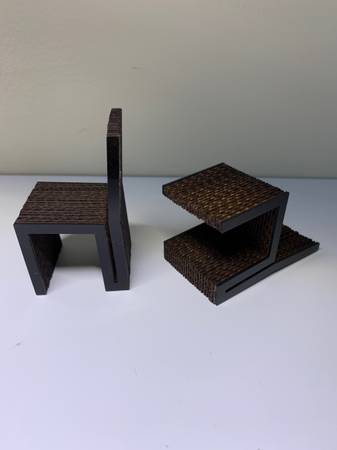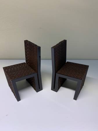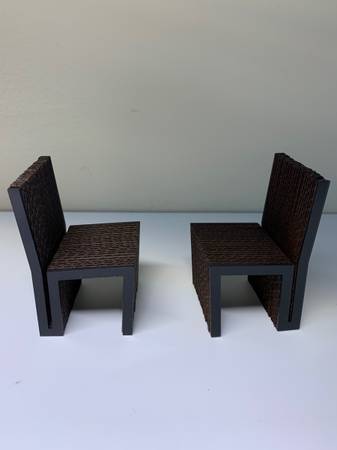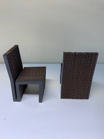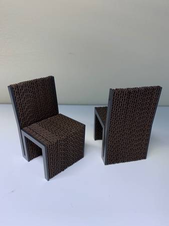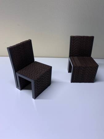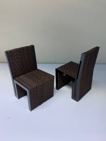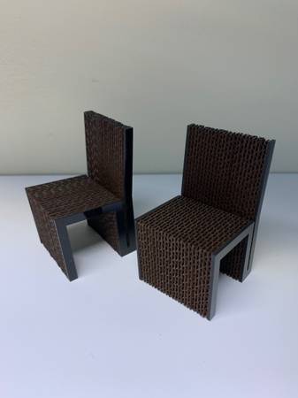 BRAND NEW / NEVER USED / FLAWLESS****SELLING AS A SET OF 2 Deep brown with glossy black acrylic edging. Hand crafted mid century modern set of dining chairs designed and inspired after the Frank Gehry cardboard chair for VITRA Edition. These are inspired by but not officially Vitra products. Constructed of corrugated cardboard and acrylic with modern and sleek lines.The structure is extremely firm and stable. These chairs are super refined collectibles and suitable for a dollhouse but not for children.1:12 Scalewidth: 1.75"depth: 1.75"height: 2.85"