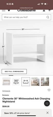 Crate and Barrel Clemente 30" Whitewashed Ash Charging nightstand. Purchased less than a year ago - gently used with few nicks see pics. Selling due to no room in apt. Purchased for $599 plus tax...