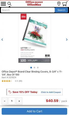 Office Depot Brand Clear Binding Covers, 8-3/4" x 11-1/4" ($40 online). 100 Pack. Selling for only $15. Brand new, plastic sealed. >>>Message seller to buy. ***Include contact number.
