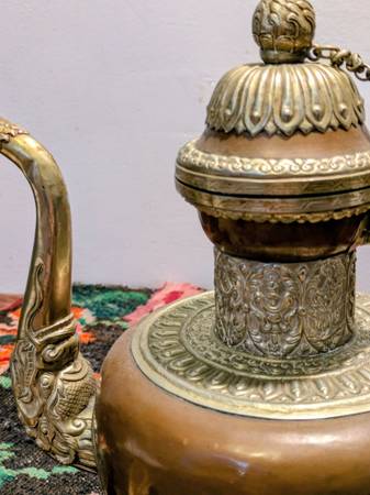 Beautiful and highly ornate Tibetan-style ewer, perfect as a stunning decorative piece. It features a copper body with intricate, decorative metalwork on the spout, lid, and a striking dragon-shaped...