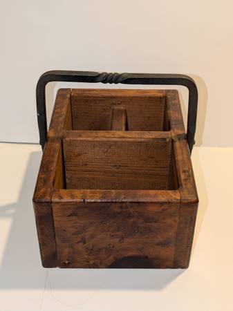 Vintage-style wooden caddy with a hand-forged iron handle, perfect as a rustic cutlery holder, bar organizer, or handy art pencil tote.