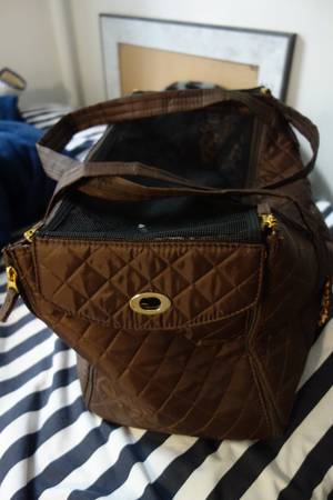 Airline-approved Sherpa pet bag for small to medium-sized animals. 16" long, 9" across and 11" high. Multiple pockets in a plush, quilted brown fabric, sturdy straps and ventilated construction. Removable, washable faux-fleece velcros securely to bottom panel. Fully un-zippable to lay flat as a sleeping mat or padded play area. Originally $74.99