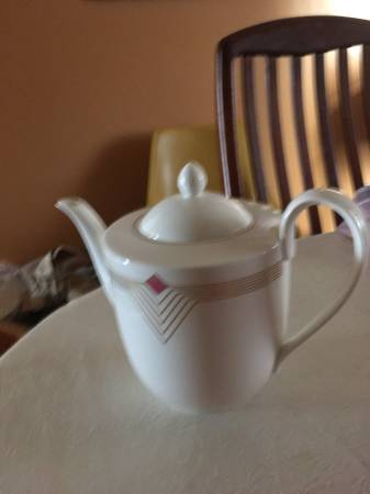 Villeroy & Boch modern design bone china in pink and gold made in West Germany ca. 1986. Like-new condition, used only a few times since purchased new in the 1980s. Service for 12 plus multiple serving pieces. (65 pieces total).