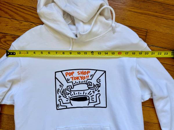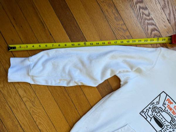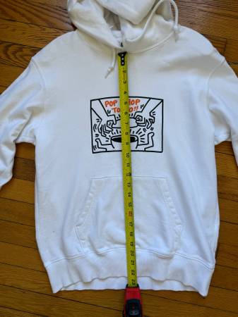 White Keith Haring Tokyo Pop Shop Hoodie Pullover Sweatshirt Soft & Warm Men’s Size Small (A Roomy fit for Women who wear Small & Medium) Very Gently Worn Small 1.5 inch spot on bottom of...