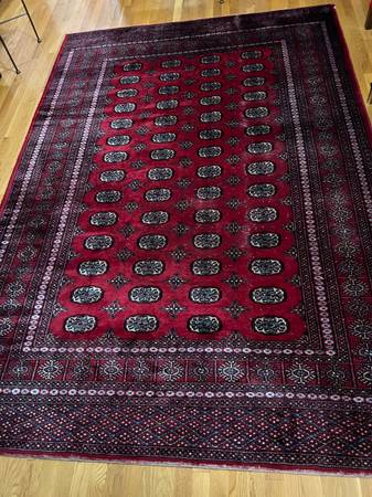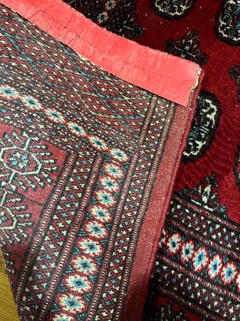 I’ve enjoyed this rug for nearly 20 years. It’s freshly shampooed for sale. No stains but worn in places (see photos). 100% wool. Please note that I taped the fringes under for my roomba.