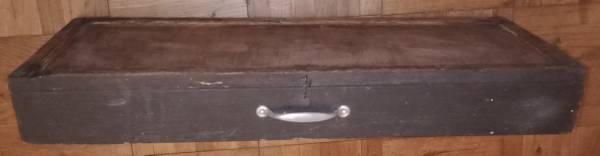 Vintage Solid Wood Box $90 Cash Only Green felt lining Flat Hook latch secures the Primitive Box Metal Handle Shows signs of age and heavy use / wear Measurements: Height: 3 - 3/4” Length: 28 - 1/2”...