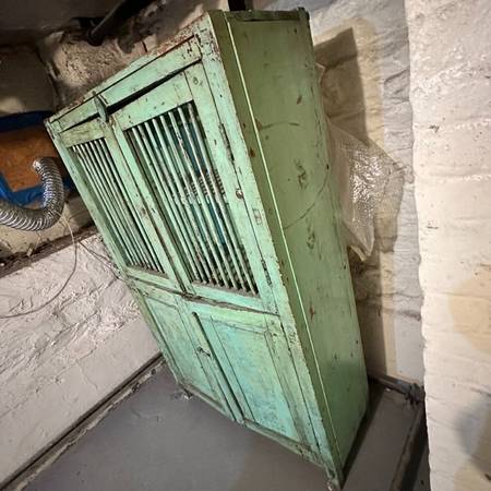 An Indian antique wooden kitchen cabinet (pantry) from the early 20th century with distressed finish and slatted doors. Fabulous teal green color and with incredible storage space. The lower half features 2 enclosed shelves and the upper has two additional shelves behind the slatted doors. We're downsizing and have to let go of some of our beloved antiques. Would like to see this one going to a good home!