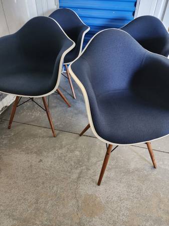 Authentic Herman Miller Eames upholstered molded blue color fiberglass arm chairs in navy blue hopsack color fabric, with walnut dowel base.4 available $525 each. will negotiate in price if buying in multiples.