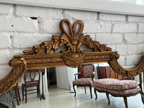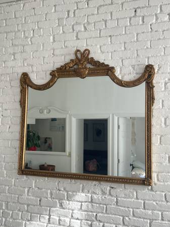 Ornate gold mirror with a bow on top is Rococo Revival style mirror.