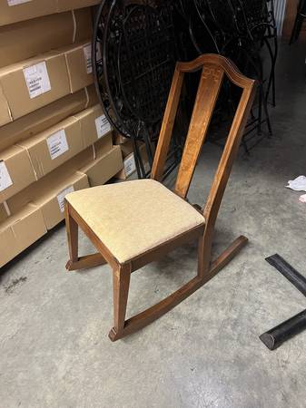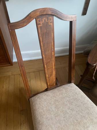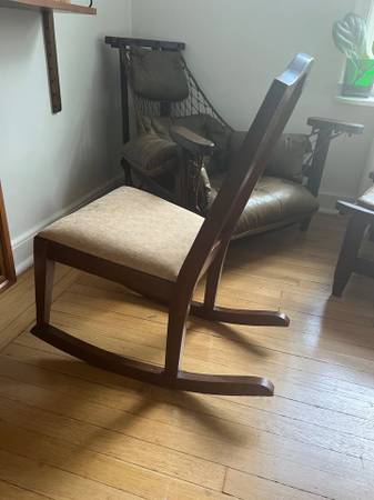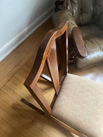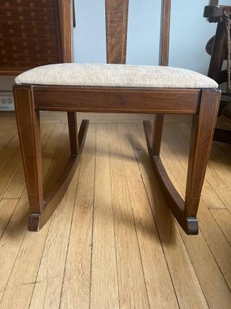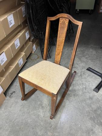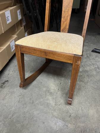 Condition: Used - Good Color: Brown Date Range: 1910-1919 Antique French Mission Rocking Chair Regency Mahogany Inlay Details Upholstered seat Solid Wood Beautiful Craftsmanship Armless Simple...