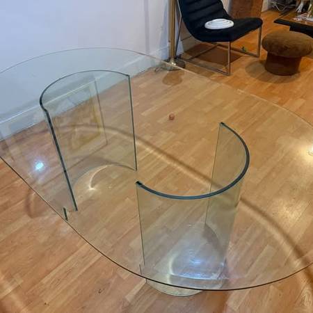 Stunning all glass modern dining table with dual (2) semi-circle pedestal bases and an elliptical shaped oval top. Beveled edges. Beautiful condition, minor scratches. Comes in three pieces. Originally priced as $1,200. 72" in length, 42" in width, and 30" in height