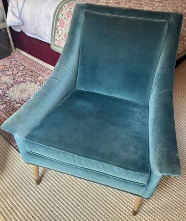 Anthropologie Tillie Armchair in teal cotton velvet. Legs are gray-washed wood with brass tips. Slight fading on arms from sunlight. Looks terrific, super comfortable, and has a lot of great years...
