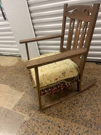 Antique craftsman arts and crafts oak rocker is in good shape. This can be used as is or freshen it up with new fabric. This measures 26”w x 28”d x 32 back height x 14” seat height.