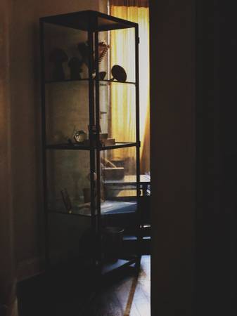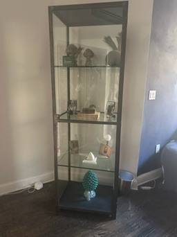 This glass and metal cabinet holds both structure and light, its tall frame creating a quiet presence in the room. The slender metalwork gives it an airy quality, while the glass panes reflect shifting light, making each object inside feel curated and intentional. A display of form and function, it offers a space for treasured pieces, allowing them to be seen while remaining enclosed in stillness. A piece that brings depth, warmth, and a sense of quiet wonder to any space.