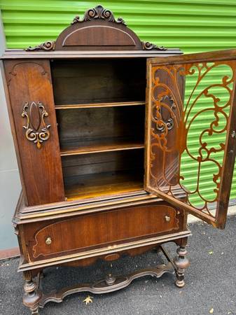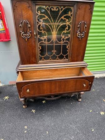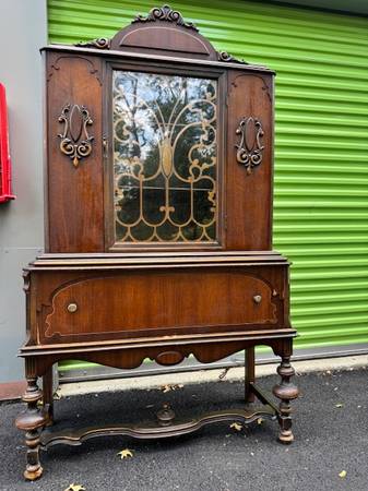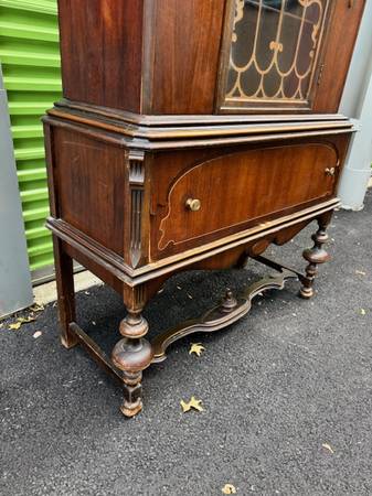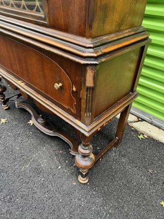 Antique walnut arched top depression China cabinet is in good shape. This is made of wood construction with walnut veneers on it. This has some minor blemishes but otherwise a gorgeous piece. This measures 45"w x 18"d x 76"h with the drawer at 39 inches wide by 10 inches deep glass door is 20 inches wide by 30 inches tall inside shelf spacing is 9 inches 10 inches and 10 1/2 inches from top to bottom.