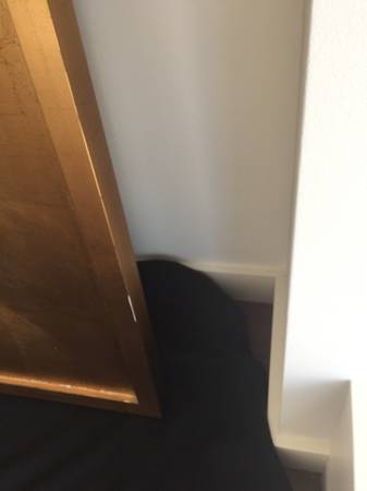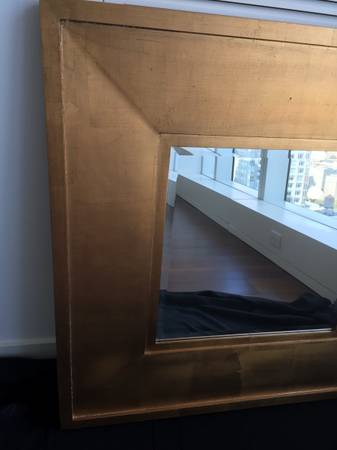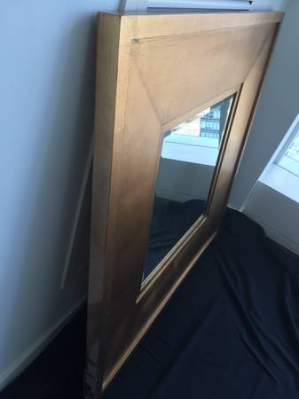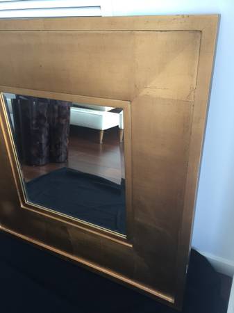 Beveled mirror, fir wood construction, gold leaf antiqued finish. Overall 37.25x37.25”x1.5” Mirror 20x20”