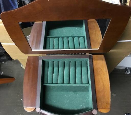 Features: pop-up mirror, necklace/ring/bracelet organizer, velvet lined drawer, x2 pop-up side doors.