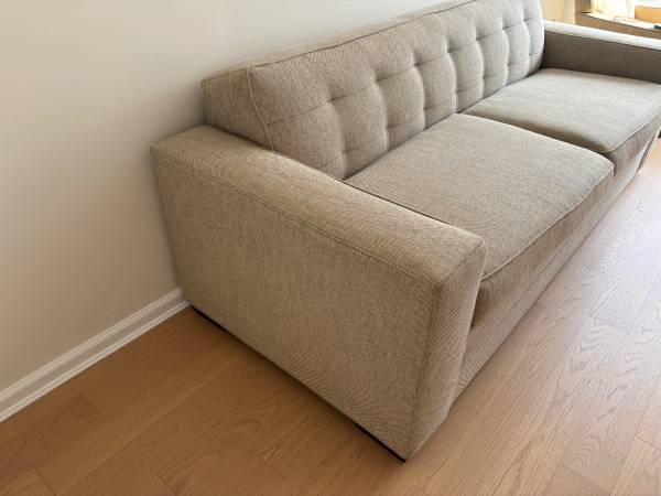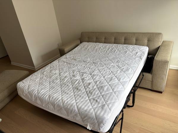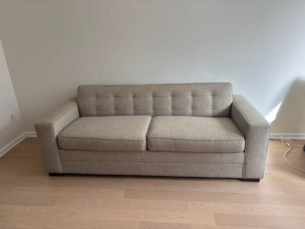 Gorgeous sofa by premium designer, manufactured in North Carolina in a beige-oatmeal fabric with subtle threads of blue, olive, and grey. It has a timeless, elegant look with clean contemporary lines and wide flat arms. Very comfortable and includes a brand-new thick sleeper mattress that's never been used!