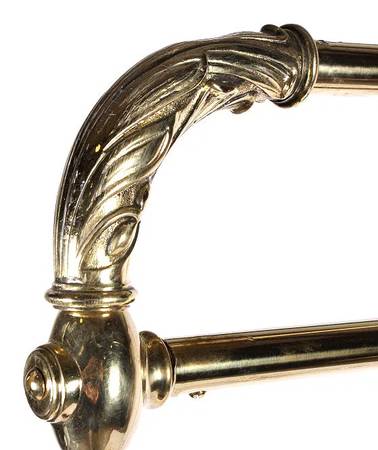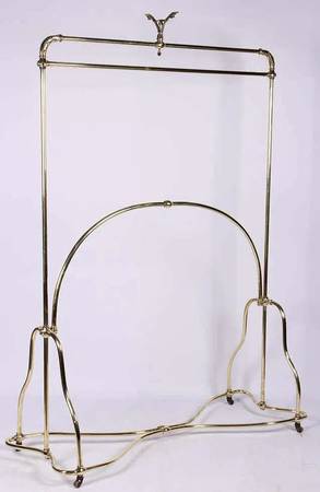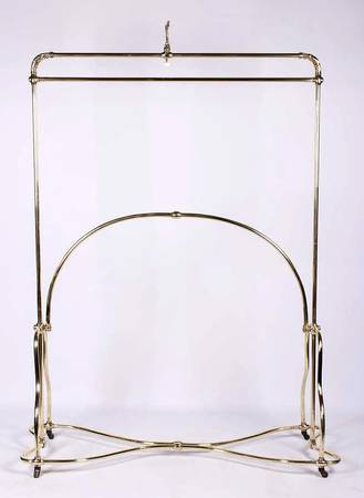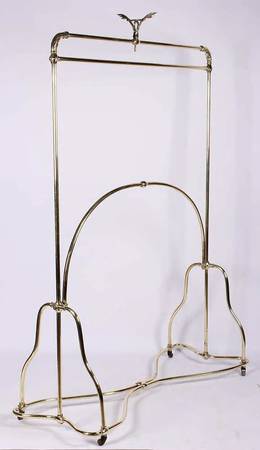 This is a 19th century solid brass coat rack in great condition with only major dent. The piece has unique and ornate corner and top accents. The piece has wonderful color and casters. Measures 84"...