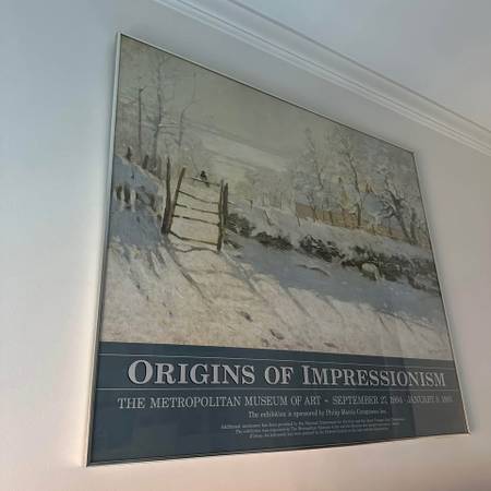 •XL Framed Vintage 90s MET Impressionism Exhibition Poster featuring Claude Monet’s 1868 painting ‘The Magpie’ - Winter Scene. Brushed chrome metal frame measures 41.25”W x 36”H Local NYC- delivery...