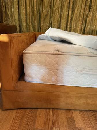 Unique custom-made daybed that fits a full-size mattress (most daybeds are only twin). Works beautifully as a deep, comfortable sofa during the day and a full bed at night—perfect for studios or guest rooms.