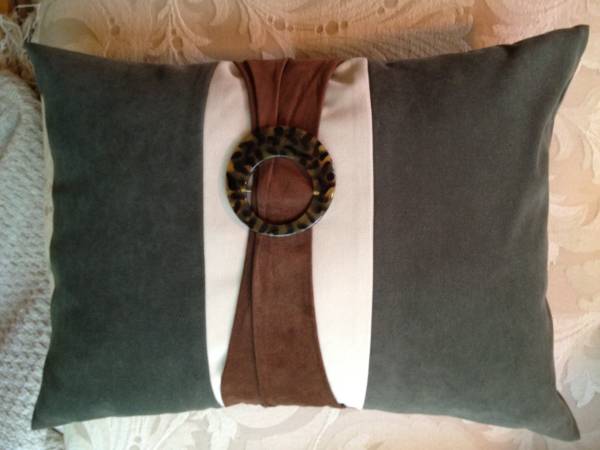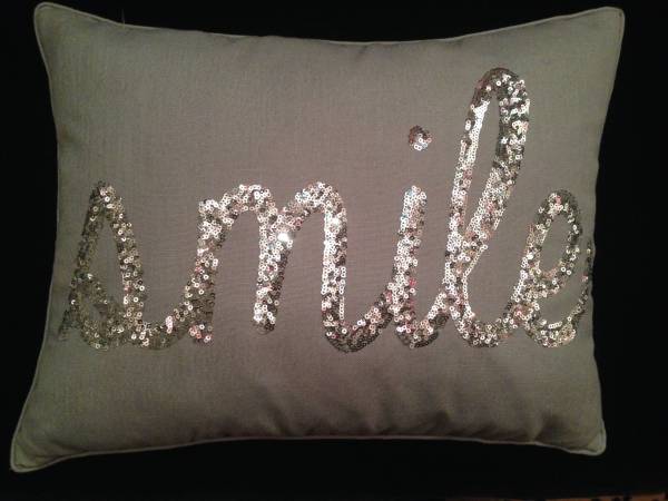 - "Smile pillow"spelled in Silver Sequins on a silver-gray cotton pillow cover, 12" x 16": $ 20.