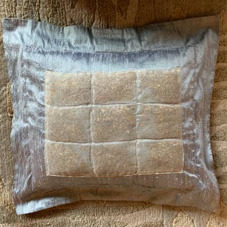 - Silvery silk tufted mini-pillow with flange, stuffed with fresh lavender in removable insert.14" x 13": $25.