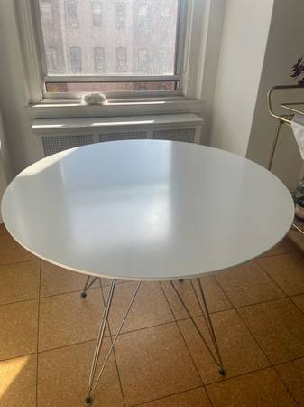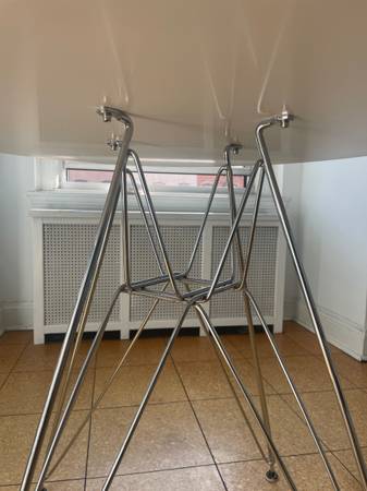 Stylish dining table with metal legs. Dupe of the iconic Eiffel series by Eames. Sits up to 4 chairs. Small chip on the surface, see last photo, other than that in great conditions. 36 diameter, 29...