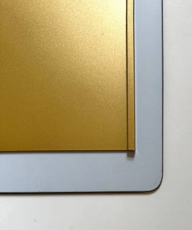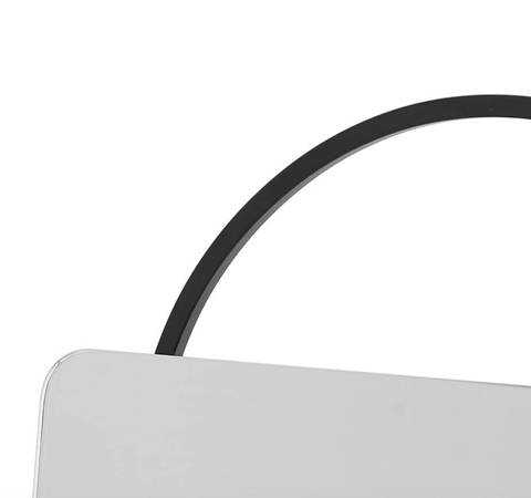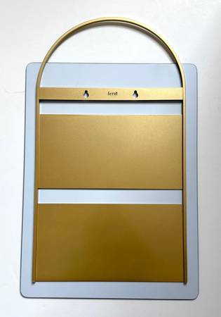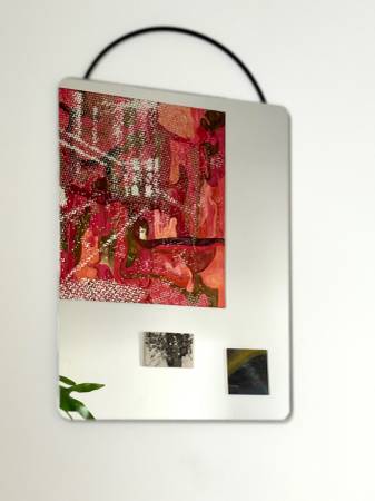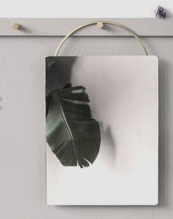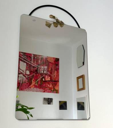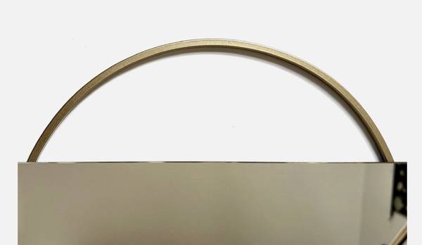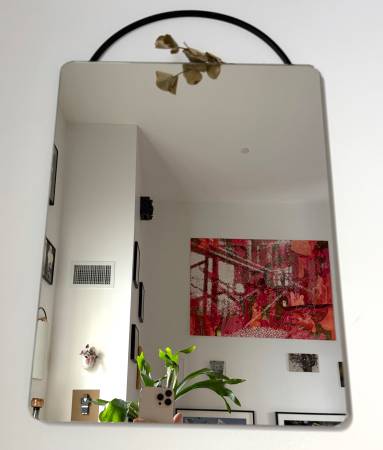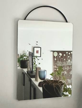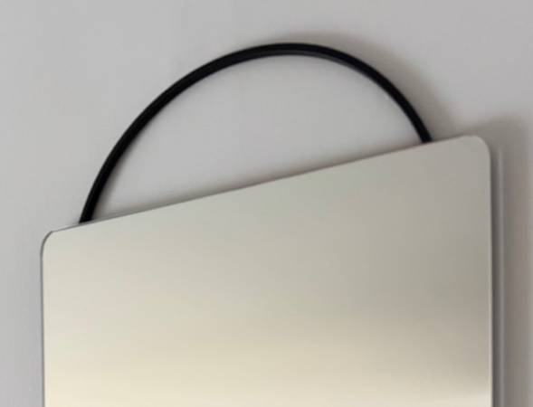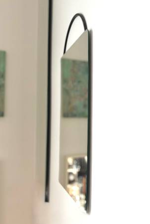 Condition. Excellent with some minor scratches on the back of mirror around mounting eyelets from placement on nails for wall mounts. Mirror features a curved metal bar that adds a decorative element for the simple, rectangular mirror. The bar can also be used for hanging the mirror to the wall. Adorn mirror has also eyelets on the backside for mounting. (See photos.)