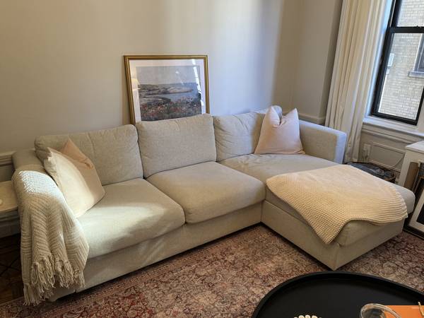 IKEA sofa in good condition, would be $1480 if purchased new from IKEA. The sofa fully disassembles, and all of the covers are washable. The chaise doubles as storage. We do not have a dog, do not smoke, and there are no funky odors. One arm of the sofa has some pilling, and the chaise arm is finnicky, but otherwise it's in good condition. Dimensions are here: