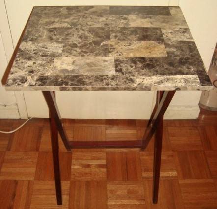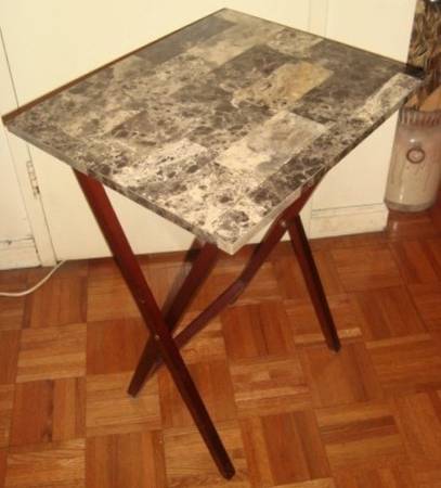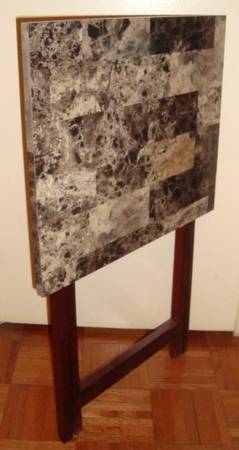 Folding Snack Table – Brown Faux Marble Finish $25 Cash Only The table surface is large enough to be used for serving a meal or snack, working on paperwork or laptop. Folds for easy storage when not...