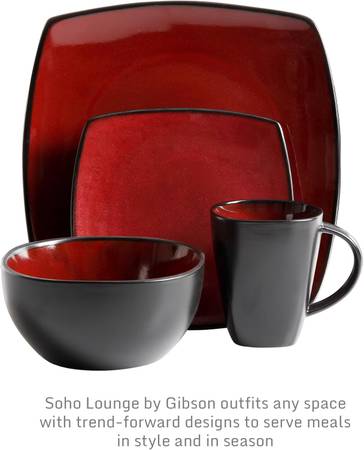 Gibson's Red Soho Lounge Dinnerware Set features classic stoneware dinnerware. The set has a black exterior and is made from ceramic material. Durable thick dinnerware is difficult to scratch or break. 16-piece stoneware set includes four place settings each of 12.75-inch dinner plate, 9-inch dessert plate, 6.25-inch bowl and 12 ounce mug (plates and bowls measured diagonally). Bold designs for the bold at heart. Traditional finishing techniques produce differences in color, size and texture, ensuring no two pieces are exactly alike. Set is dishwasher and microwave safe for easy clean.