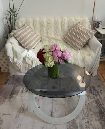 Selling a stylish glass coffee table. The table has a modern circular base and a tinted glass top. It has some wear on the surface, but overall it looks very chic and elevates any space. Pickup only...