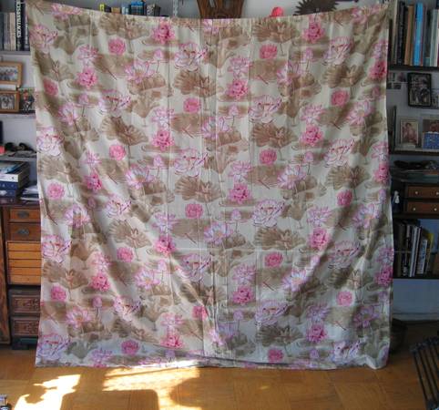 ... SHOWER CURTAIN Exotic blooms, accented pinks lotus and dragonflies come to life on a full size fabric curtain, used but like new.