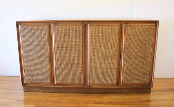 The second is credenza cabinet designed by Jack Cartwright for Founders that has four doors with rattan fronts and brass pulls, two top drawers, and two shelves. Dimensions: 52"W x 18"D x 29"H. Selling for $950.