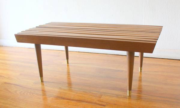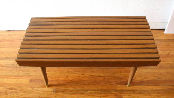 The second is a mid century modern slatted table bench with a streamlined design, angled sides, and brass tipped tapered legs. Dimensions: 36"W x 18"D x 14"H. Selling for $350.