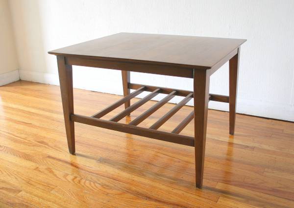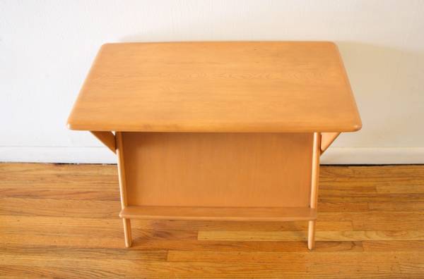 The last pictured is a rare mid century modern side end table by Heywood Wakefield, circa 1950s. It has a magazine rack, tapered legs, Wakefield's signature curved edges and angular design with their champagne finish. Dimensions: 28"W x 15"D x 22"H. Selling for $650.