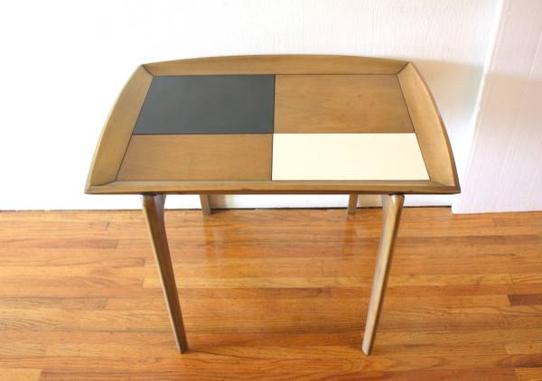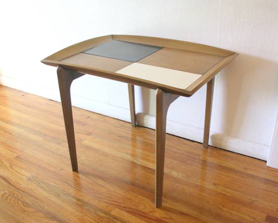 The third is mid century modern table designed by John Keal for Brown Saltman. It has a gorgeous sculpted base with tapered legs, and a top with surfboard edges and black and white lacquered accents in its design. 30"W x 22"D x 22.5"H. Selling for $550.