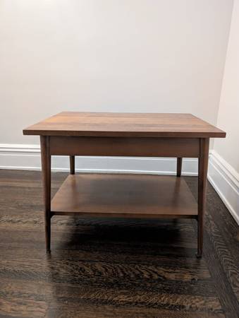 For Sale: Mid-century side table with a drawer. Walnut finish. Very good condition.
