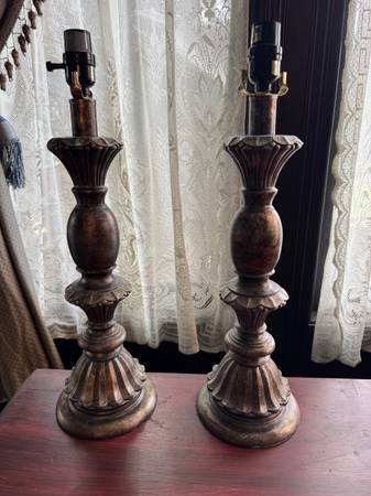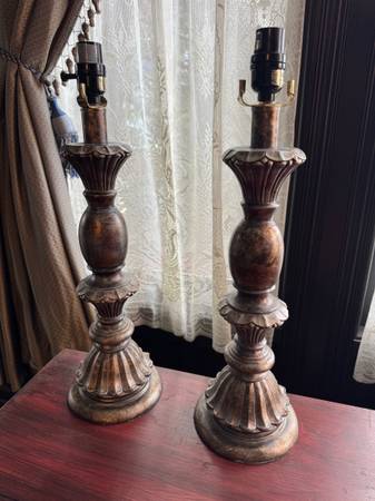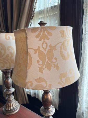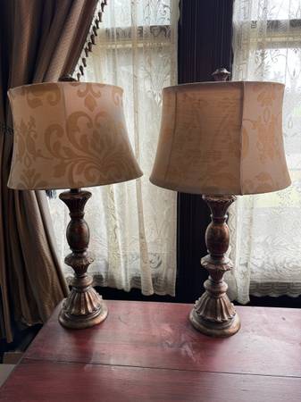 Pair of silver and bronze finished lamps with shades are in good shape. These lamps have been rewired and ready to be used. They measure 6” round 29” tall with the shade 15” diameter x 10” tall.