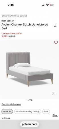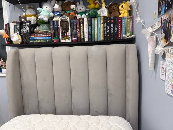 Excellent condition. No visible wear and tear. Pottery barn upholstered grey twin bed for sale. 79st York ave