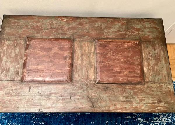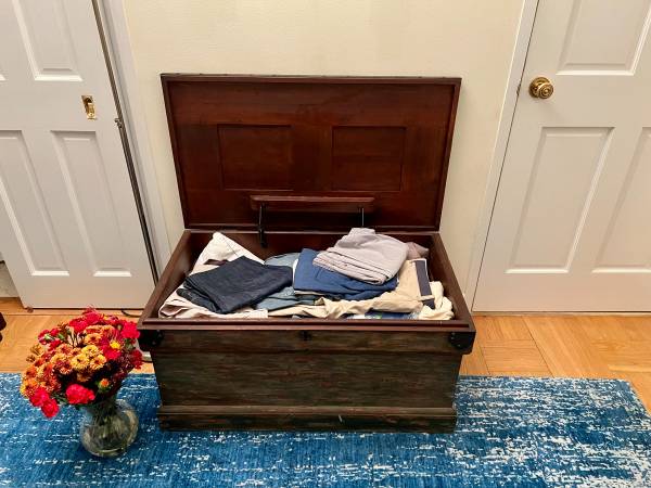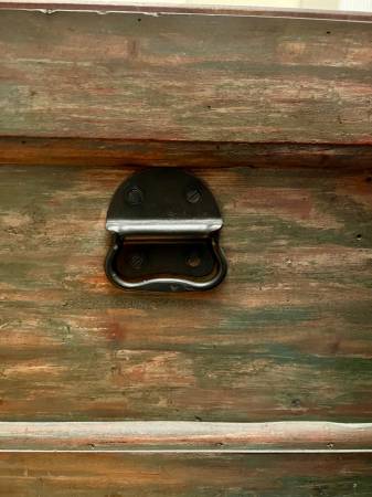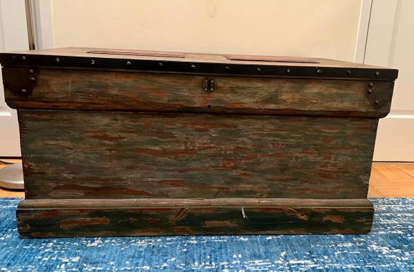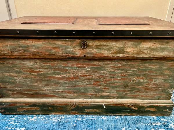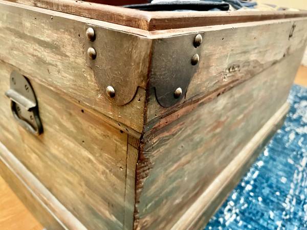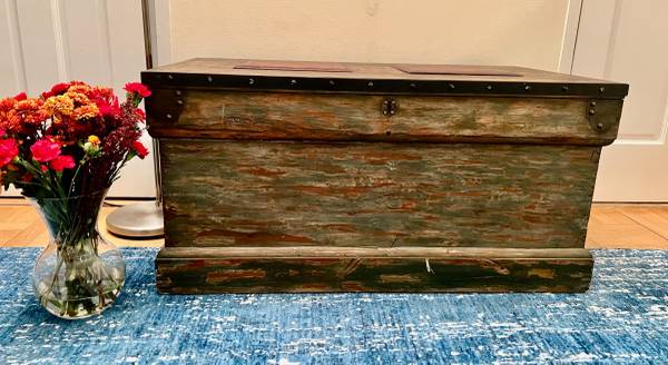 Selling this beautiful rustic trunk originally purchased from Pottery Barn in 2012. It’s full of character with a weathered finish in earthy green and reddish-brown tones, accented by black metal trim and rivets. Works perfectly as a coffee table, entryway bench, or blanket/storage chest — with a generous interior and a sturdy, solid wood build.