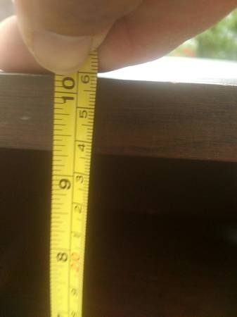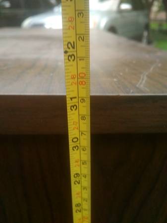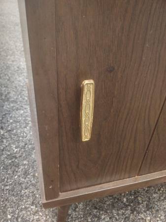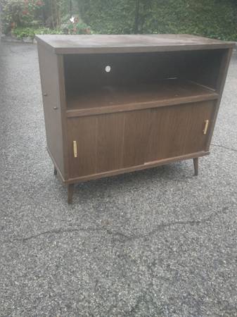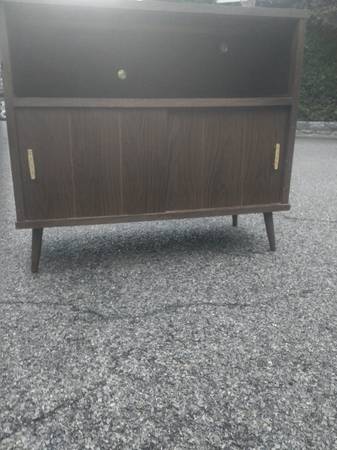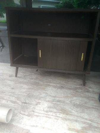 MCM record stand 36" wide 16" deep (14" on the inside) 31" tall top shelf is 9" tall bottom shelf is 13" tall sliding door panels pressed wood / not a solid wood piece a little wobbly. but would...